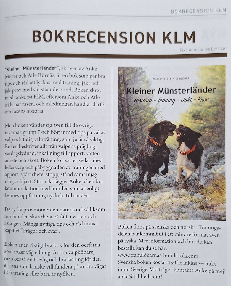 "Redan fått vårt exemplar. Kan verkligen rekommenderas, skaffat till förstagångsägare av Kleiner Münsterländer. Såå mycket samlad fakta, tips och erfarna råd!"
