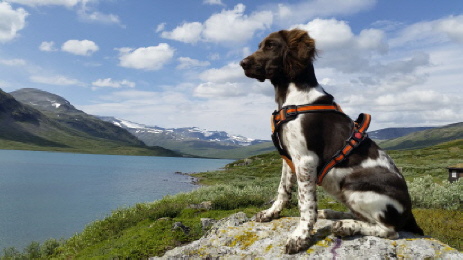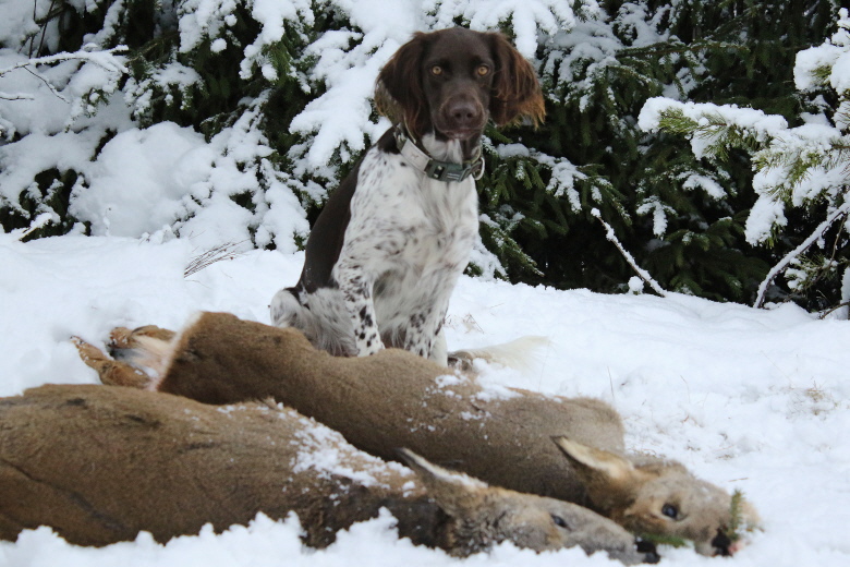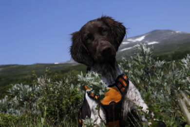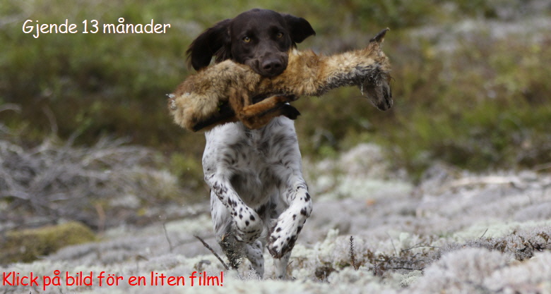 Nu är Gjende 10 månader och har blivit en fullvärdig liten jakthund. Hon använder näsan fantastiskt, hittar allt vilt, även på längre distans, försöker stöta/driva mot jägaren, jagar med skall på sikt och på löpan, apporterar väldigt fint, följer viltet lite för långt, men kommer raskt tillbaka till föraren, går väldigt fint fot utan koppel och kan alltså redan vara löst under pyrschjakt. Gjende ståndskallar fint och fungerar redan som trädskallare, som alla mina hundar. Hon är en dröm på vaktjakt: absolut lugn och still. Vilken liten tjej - jag är mycket nöjd och lyckligt över min lilla jaktkompis.