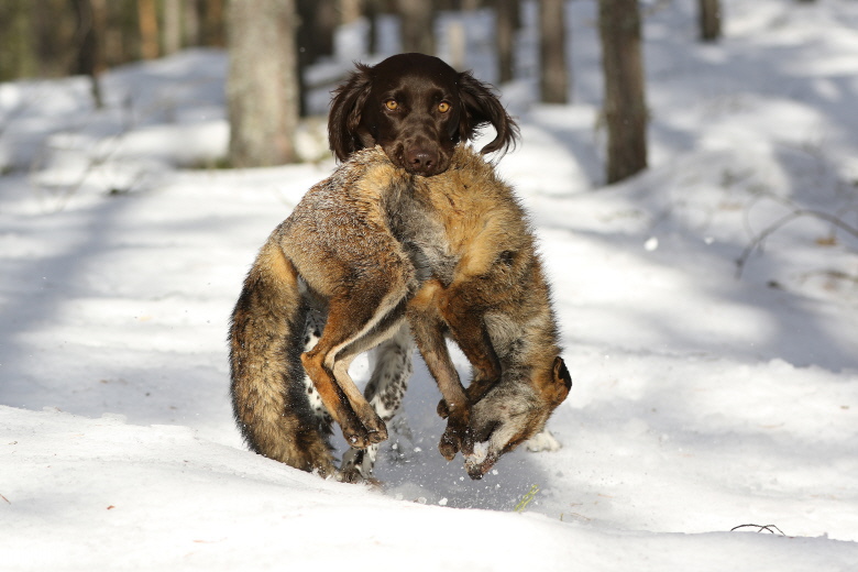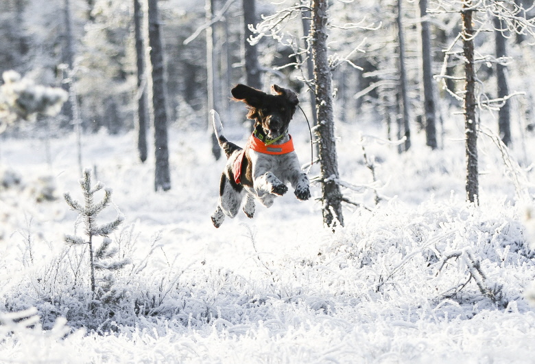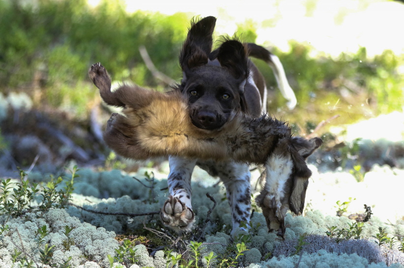 Jag jagade ensam med Gjende idag och var ca 30m bakom henne när hon plötsligt stod fast. Jag stannade för att jag vet att fåglarna troligen inte skulle tåla mitt närmande och skulle flyga iväg åt andra hållet. Plötsligt kom Gjende tillbaka med en meningsfull blick. Jag stod där och stannade. Nu började hon springa i en vid båge till andra hållet för att kort därefter trycka ut orren bakifrån, precis mot mig. Pang! Kort därefter försvann hon in i den täta skogen på samma sätt och gjorde samma sak igen. En andra orre flög till mig, den här gången nästan i ansiktet. Vilken smart jaktstrategi i en så ung hund. Hennes mormor Nele behärskade denna teknik till perfektion, jag beskriver det i KlM-boken. Antonia kan göra det också, men att den lilla ettåring redan använder det så perfekt är imponerande. Senare på turen hittade vi till och med en av de sällsynta hararna och som avslutning på dagen kunde jag höra Gjendes fantastiska skall när hon förföljde haren i mer än en kilometer.