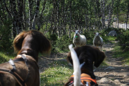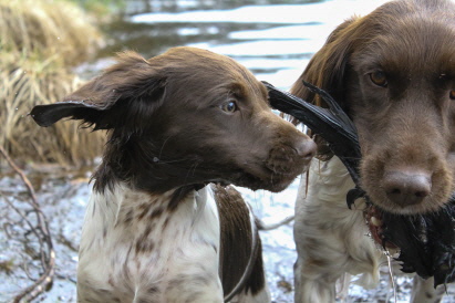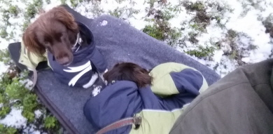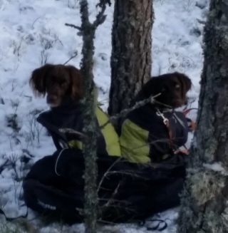 Ett kvantsprång för mig idag: första jakten med båda hundarna tillsammans. Lilla Krabaten har nu jagats in och får nu lära sig av den stora. Hittills har jag haft den lilla ensam med mig så att hon kunde lära känna allt i lugn och ro, utan att bara springa efter sin mamma och irritera henne och lika viktigt att hon lärde sig att hålla kontakten med mig, som hon nu behärskar perfekt. Idag debuterade jag med båda hundarna tillsammans och jag blev jätteglad. Båda hundarna jagade i sin egen takt. Gjendes jaktstil kan kallas "turbo-stil", medan Antonias jaktstil kan kallas "effektiv kvalitetsstil". Den lilla, som är väldigt modig och självsäker för sina unga 6 månader, lär sig nu av Antonia att söka lite närmare. För det mesta skickar man unga hundar med äldre för att forcera att de söker längre ut. Här är det tvärtom. Den lilla söker redan lite för långt ut efter min smak, vilket korrigeras genom jakt tillsammans med Antonia, som vet exakt vad jag vill. Det var väldigt spännande och underbart att se båda hundarna jaga samtidigt och i harmoni. Eftersom jag jagar mycket oftare än husse kan jag nu gå på jakt igen, oavsett om husse jagar samtidigt med Antonia eller inte, så som jag brukade göra förut med Nele och Antonia. Den lite annorlunda ”valpjakttiden” är äntligen över. HÄRLIGT!