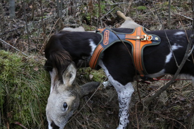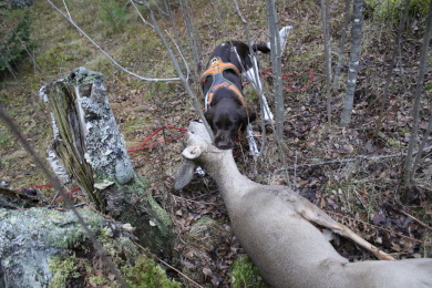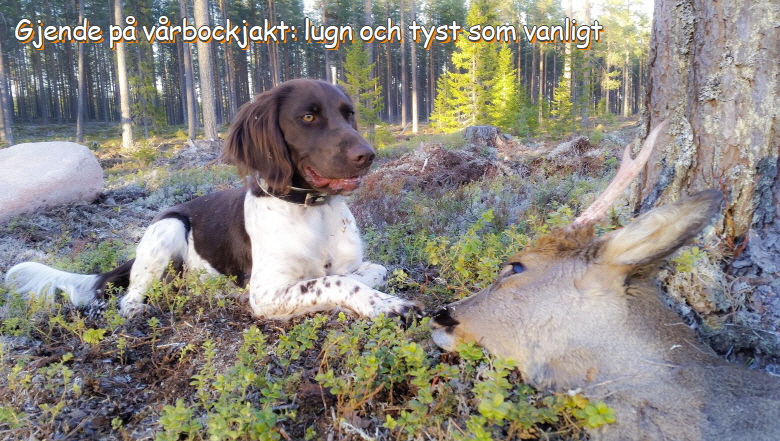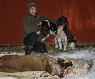 Jag är så stolt över min "lilla krabat". Ett svårt eftersök i natt utan blod i spåret, men jag bestämde mig ändå att ta lilla Gjende. Jag har fullt förtroende till min ettåring. Gjendes mamma Antonia följde som backup med skytten. Hon ville jag ha med i fallet situationen krävde att jag skickar en hund lös efter bocken. I så fall gäller inte unghundens träning utan den mest professionella och snabbast möjliga avslutning. Gjende hittade skottplatsen och jobbade sig lugnt och tydligt markerande fram till viltet. Det var underbart att se hur hon jobbade i skarpa läget - precis så som vi brukar träna: lugnt, koncentrerad, markerande och absolut spårsäkert. Bocken låg död 200m bort i buskig skog. Omöjligt att hitta utan hund. Skytten var glad och vi 3 tjejer mycket stolta.