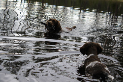 Vid 8 veckor ska hundarna lära sig simma. När vädret tillåter brukar mina valpar simma i 6 veckors ålder. G-kullen hade otur med vädret. Här kommer en film av Gjendes första vattenapport i 8 veckors ålder: