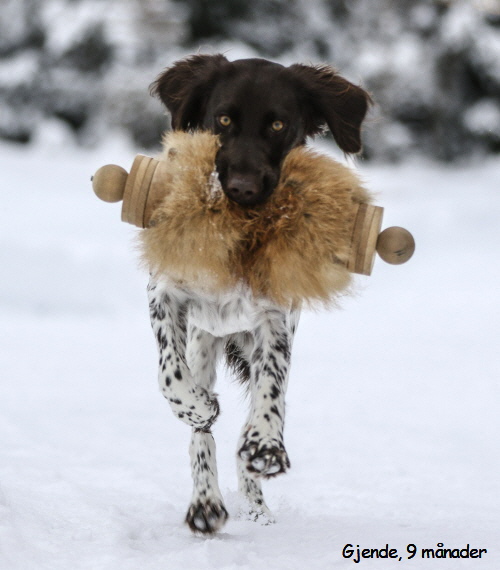 I 9 veckors ålder hämtar Gjende allt som jag "tappar" på vägen utan kommando. Man tappar apporten när hunden är bakom och helst ser inte vad man gör. När hunden kommer förbi apporten ska den ta upp och hämta. Man forcerar apporten genom att springa bort och på slutet backa lite.